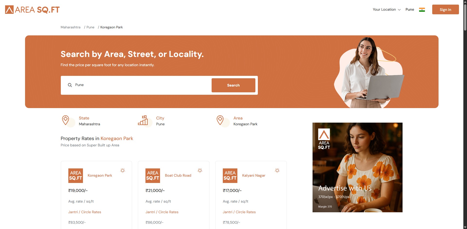 Area Square Feet is our own real estate platform designed to help people understand property prices in India. From residential to commercial areas, we’ve built a clean and informative website that shows price trends per square foot, Jantri rates, and local insights. Designed with trust and clarity in mind, this platform is built to guide home buyers, sellers, and investors with accurate, easy-to-understand data.
