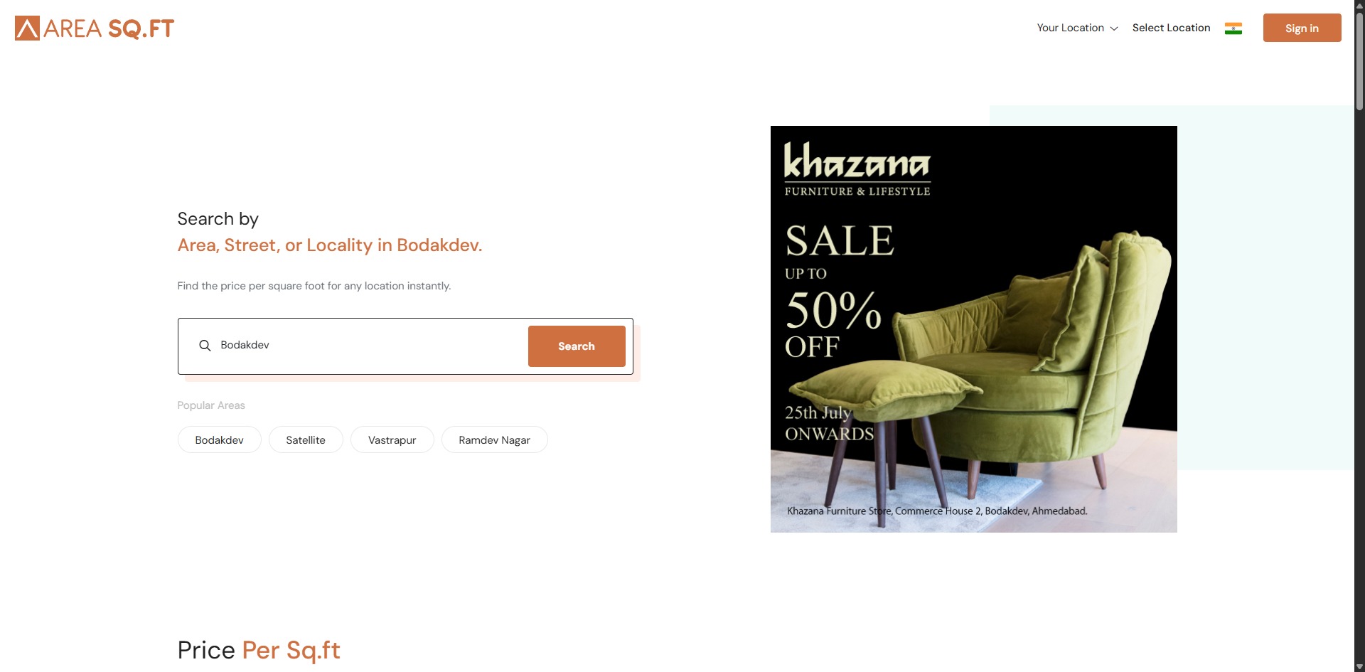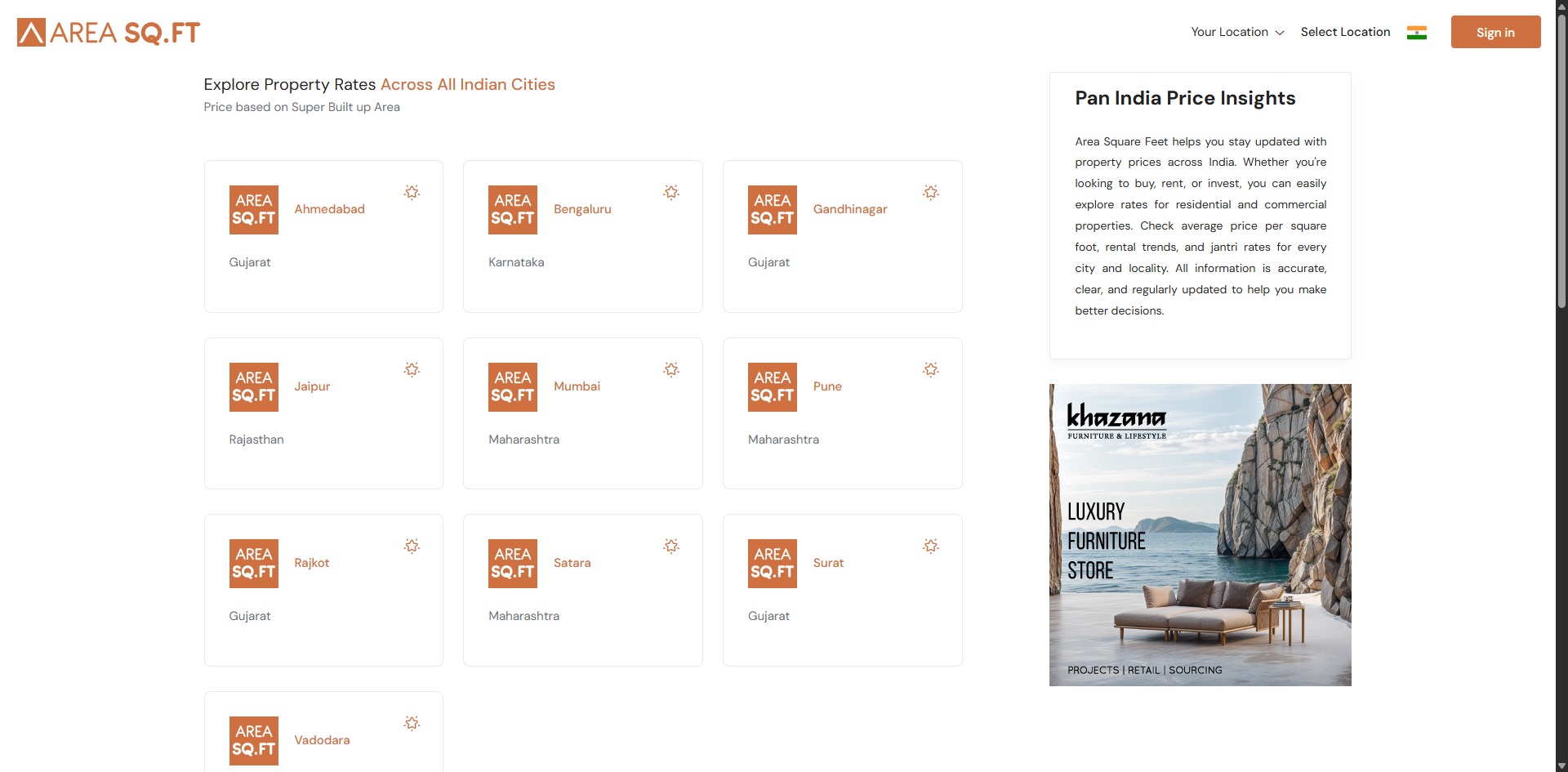 Area Square Feet is our own real estate platform designed to help people understand property prices in India. From residential to commercial areas, we’ve built a clean and informative website that shows price trends per square foot, Jantri rates, and local insights. Designed with trust and clarity in mind, this platform is built to guide home buyers, sellers, and investors with accurate, easy-to-understand data.